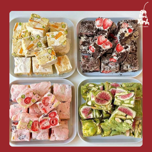 Tiếp theo là kẹo nougat tự chọn, một trong những món kẹo đang được ưa chuộng nhờ hương vị tinh tế và thành phần đa dạng. Nougat trong combo gia đình 90k được làm từ các nguyên liệu chất lượng như sữa, hạt dinh dưỡng (hạnh nhân, hạt điều, hạt dẻ cười…) và trái cây sấy. Vị ngọt dịu nhẹ, không quá gắt, kết hợp với độ dẻo mềm đặc trưng cùng độ giòn bùi của các loại hạt tạo nên một món ăn vừa ngon miệng vừa giàu dinh dưỡng. Đặc biệt, bạn có thể tự chọn hương vị nougat theo sở thích, giúp combo trở nên cá nhân hóa và hấp dẫn hơn.